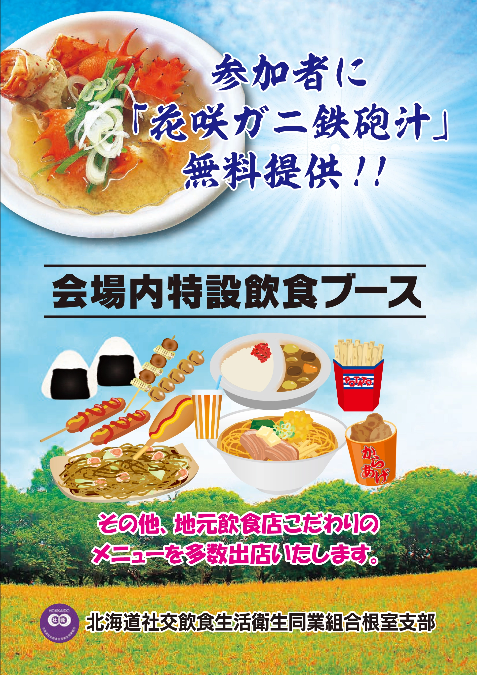 大会当日は、北海道社交飲食生活衛生同業組合根室支部様のご協力により、花咲ガニを使った「てっぽう汁」を参加者の皆さまに無償で提供します。